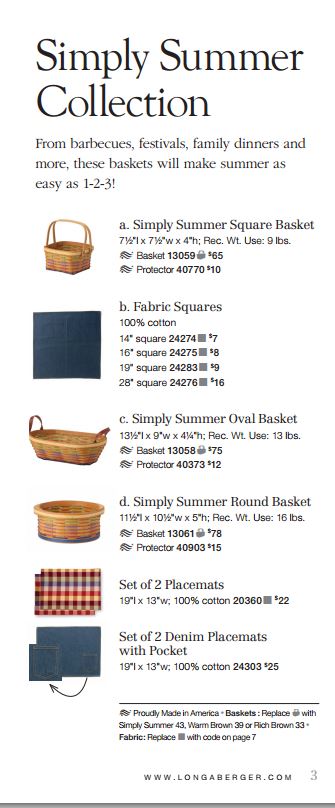 d. Simply Summer Round Basket 11½”l x 10½”w x 5″h; Rec. Wt. Use: 16 lbs. A Basket 13061# $78 A Protector 40903 $15